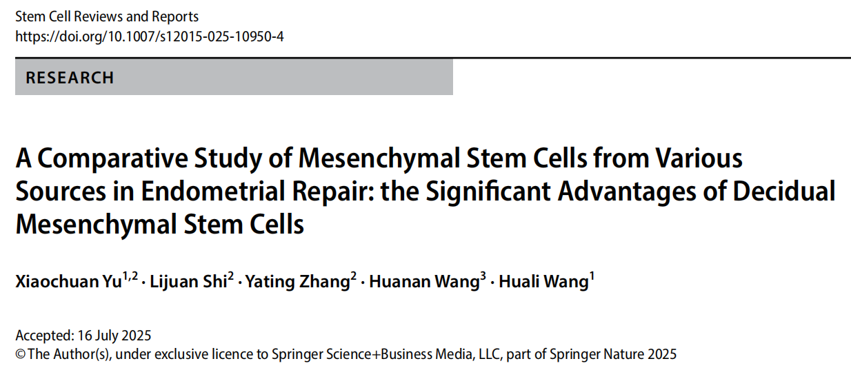 现今全球生育率的降低,针对不孕症的治疗是保障生育率的关键之一。薄型子宫内膜与宫腔粘连是导致女性不孕的主要病因。传统手术和激素治疗的疗效不甚理想,后续妊娠率不足1/3,复发率高达60%以上。因此,需要探索一种更有效的治疗手段。在沈阳细胞中心支持下,由合作单位大连医科大学和大连市妇女儿童医疗中心研究团队的研究结果“A Comparative Study of Mesenchymal Stem Cells from Various Sources in Endometrial Repair: the Significant Advantages of Decidual Mesenchymal Stem Cells”(不同来源间充质干细胞在子宫内膜修复中的比较研究:蜕膜间充质干细胞的显著优势)在国际权威期刊《Stem Cell Reviews and Reports》发表。