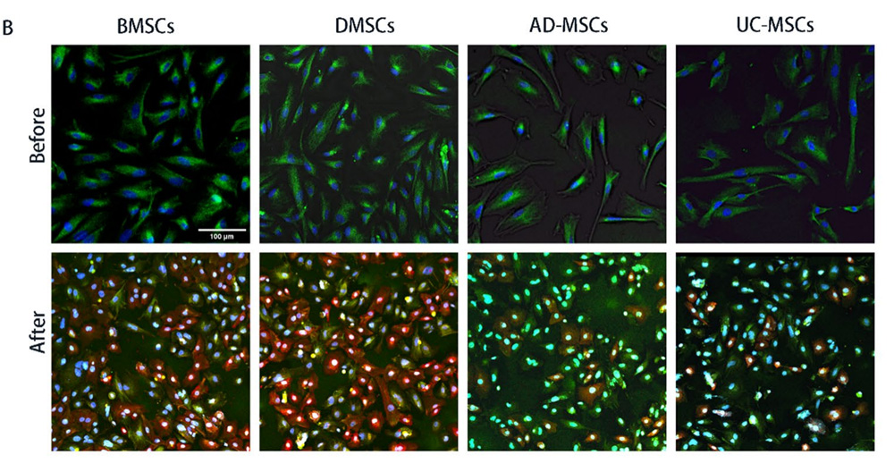 研究团队,对沈阳细胞中心提供的四种人体不同组织来源的间充质干细胞:骨髓间充质干细胞、脐带间充质干细胞、脂肪间充质干细胞和胎盘蜕膜间充质干细胞。分别检测了其增殖能力、分化子宫内膜上皮细胞潜能及在动物模型上对子宫内膜损伤的修复能力。