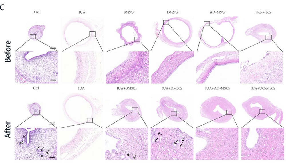 研究团队,对沈阳细胞中心提供的四种人体不同组织来源的间充质干细胞:骨髓间充质干细胞、脐带间充质干细胞、脂肪间充质干细胞和胎盘蜕膜间充质干细胞。分别检测了其增殖能力、分化子宫内膜上皮细胞潜能及在动物模型上对子宫内膜损伤的修复能力。